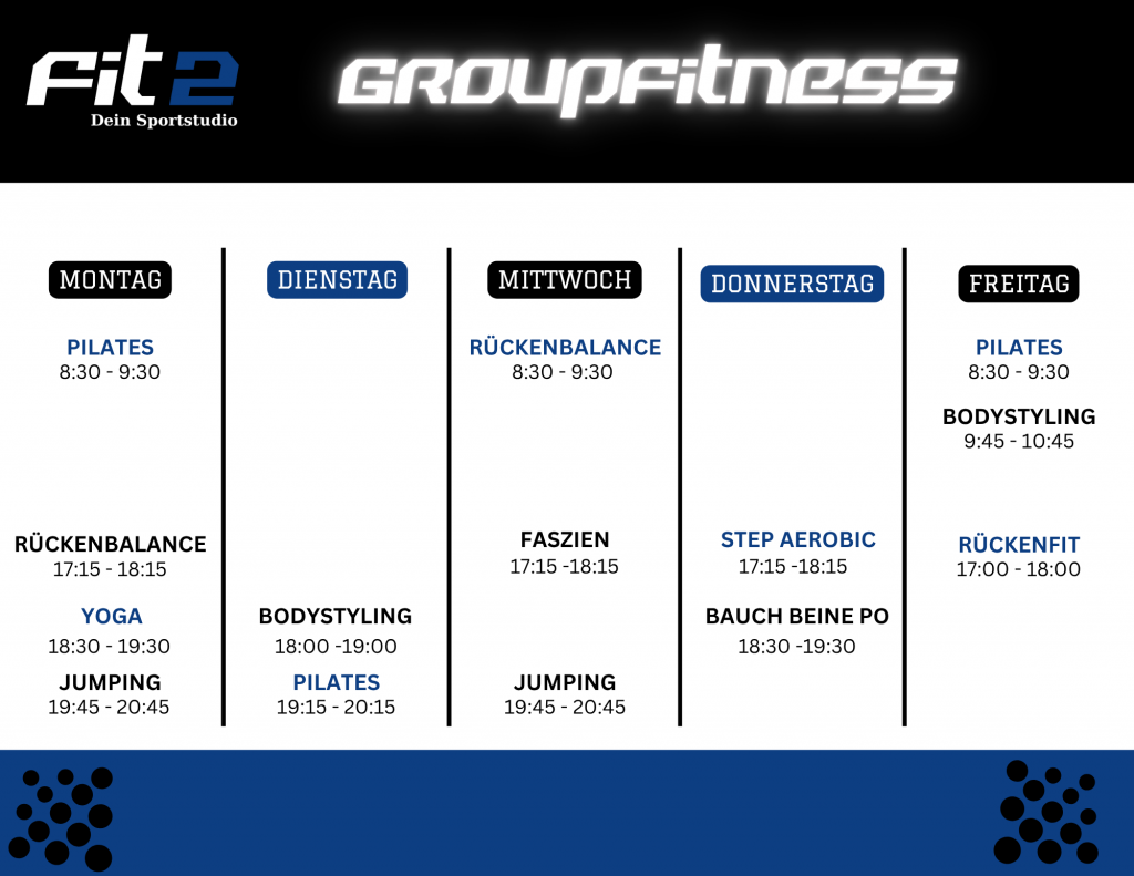 Erlebe, wie unsere Fitnesskurse dir helfen können, deine Ziele zu erreichen und gleichzeitig Spaß am Training zu haben. Bei Fit2 findest du die Motivation und Unterstützung, die du brauchst, um fit und gesund zu bleiben!