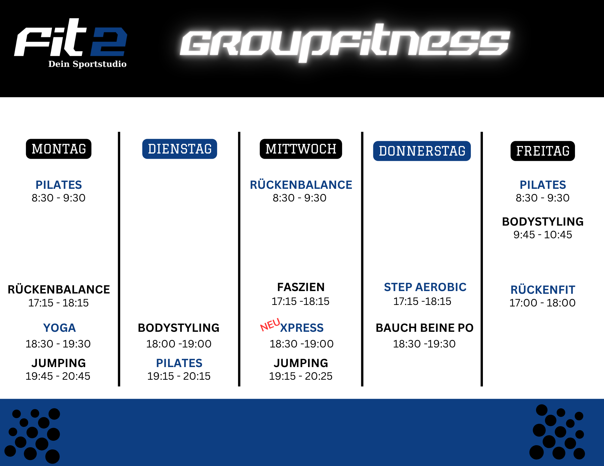 Bei Fit2 bieten wir dir eine umfassende Auswahl an Fitnesskursen, die auf unterschiedliche Bedürfnisse und Fitnesslevels zugeschnitten sind. Unsere Kurse sind darauf ausgelegt, dir ein abwechslungsreiches und effektives Training zu bieten, das dich motiviert und unterstützt.